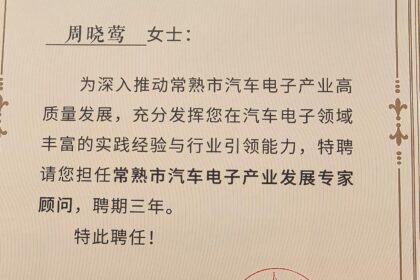 10月28日,为深入推动汽车电子产业高质量发展,常熟市人民政府正式向周晓莺女士颁发聘书,聘请其担任常熟市汽车电子产业发展专家顾问,聘期三年。 周晓莺女士,盖世汽车CEO兼资讯主编,C Talk高端访谈…