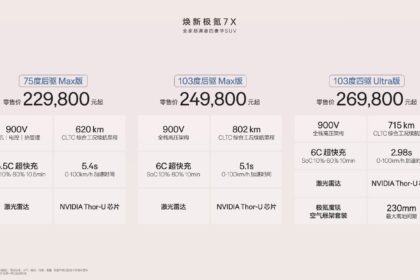 10月28日,极氪品牌正式推出焕新极氪7X,共发布75度后驱Max版、103度后驱Max版、103度四驱Ultra版三款配置,官方指导价分别为22.98万元、24.98万元和26.98万元。在“超级置…